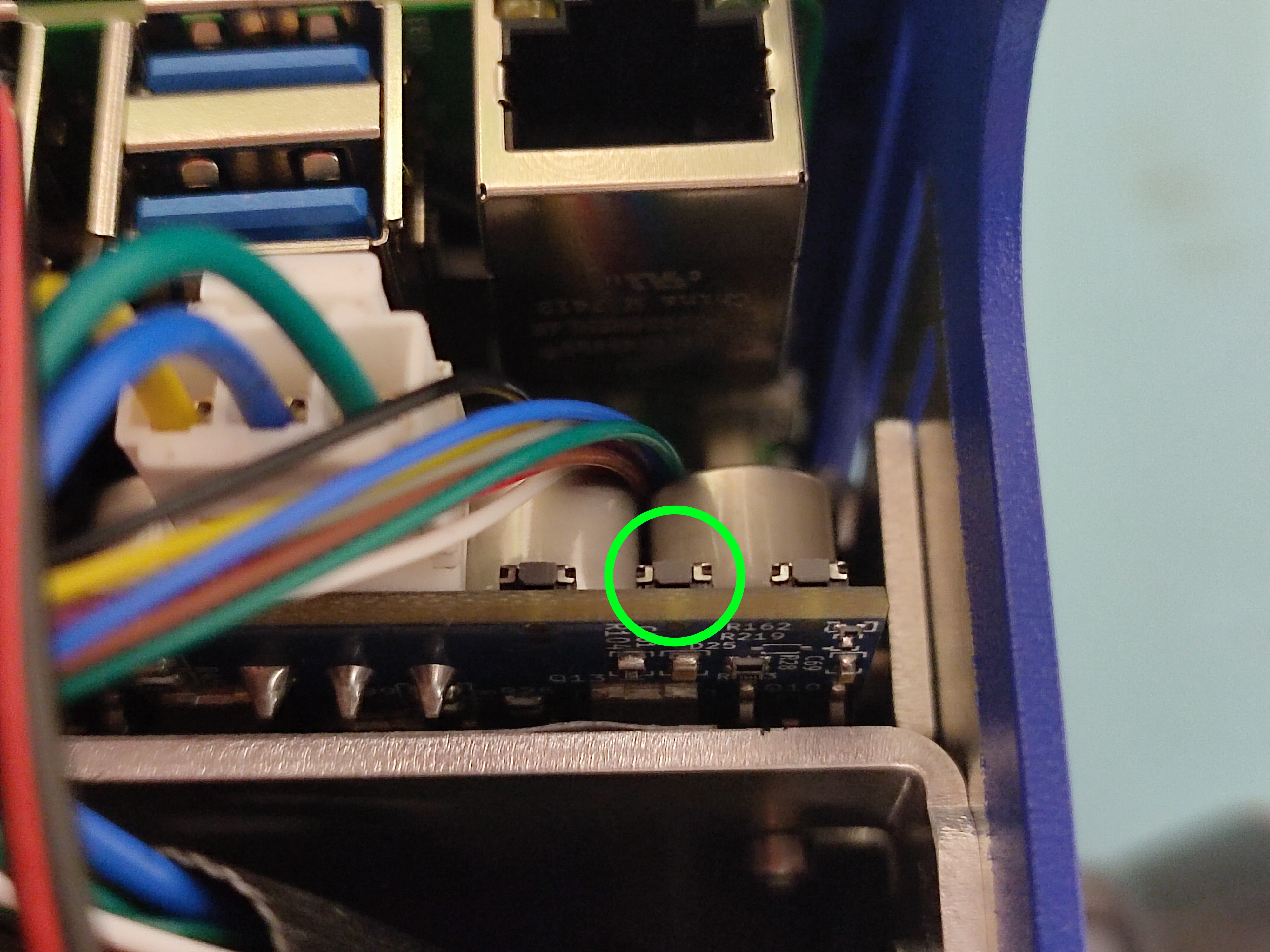 If the robot’s wheels don’t lock automatically, manually lock them by pressing the button on the Motor Control Board (MCB). It’s the button closest to the wire connector.