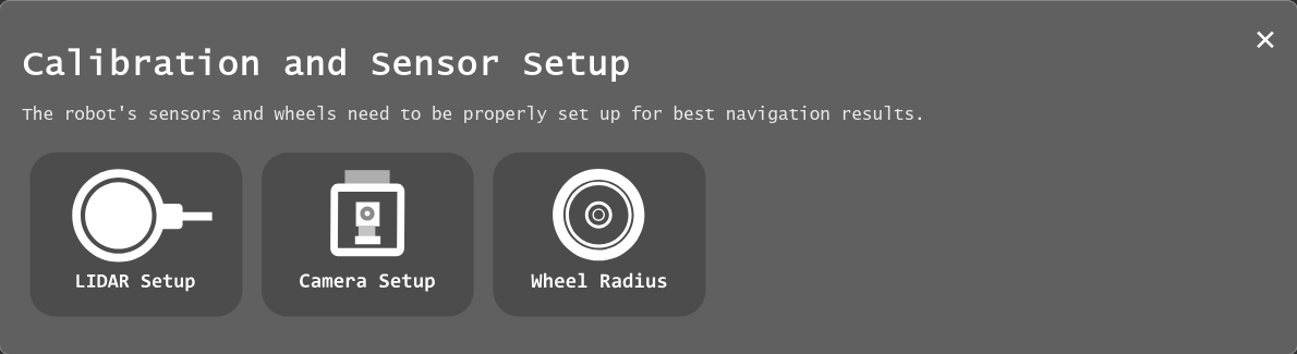When the robot first starts, you’ll be asked to provide a location and orientation for your sensors. The process can also be skipped by opening and closing the menu once and can later be accessed in the calibration menu (EZ-Map - calibration widget icon).