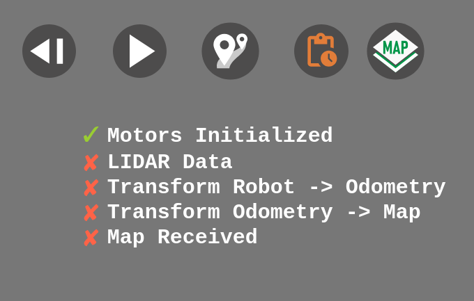 If the screen displays a checklist instead of the map, wait a minute for the system to initialize or gently move the robot so the LiDAR can collect enough data for the first map build. If the checklist remains, the system likely isn’t receiveing the required input. For example: the motor node may not be running (no battery data) or the LiDAR may be disconnected or misconfigured. The checklist will indicate what’s missing.