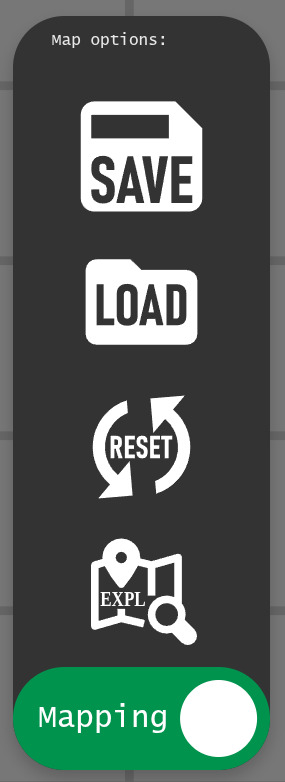 Clicking the map management icon (EZ-Map - map manegement icon) opens a dropdown menu. From here, you can view saved maps, load a selected map, or create and save a new one. Resetting the map clears the currently displayed map (without deleting saved maps) and sets the starting point (0,0) to the robot’s current location.