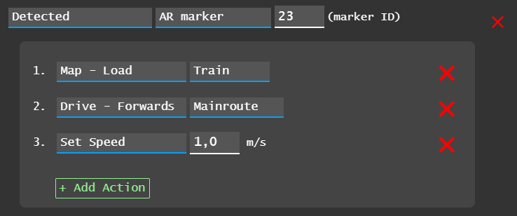 Another example: upon detecting marker 23, the robot loads a saved map and starts a predefined route at maximum speed.